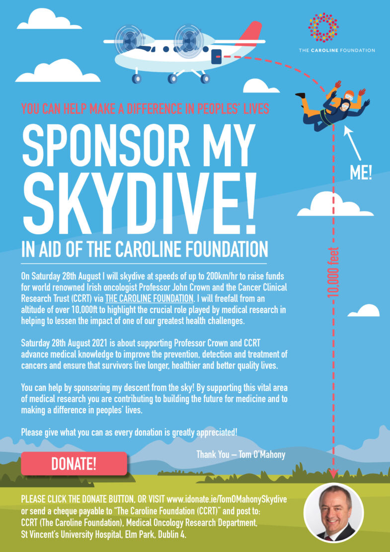 Tom O’Mahony will skydive on Saturday 28th August at speeds of up to 200km per hour to raise funds for Cancer Research…
