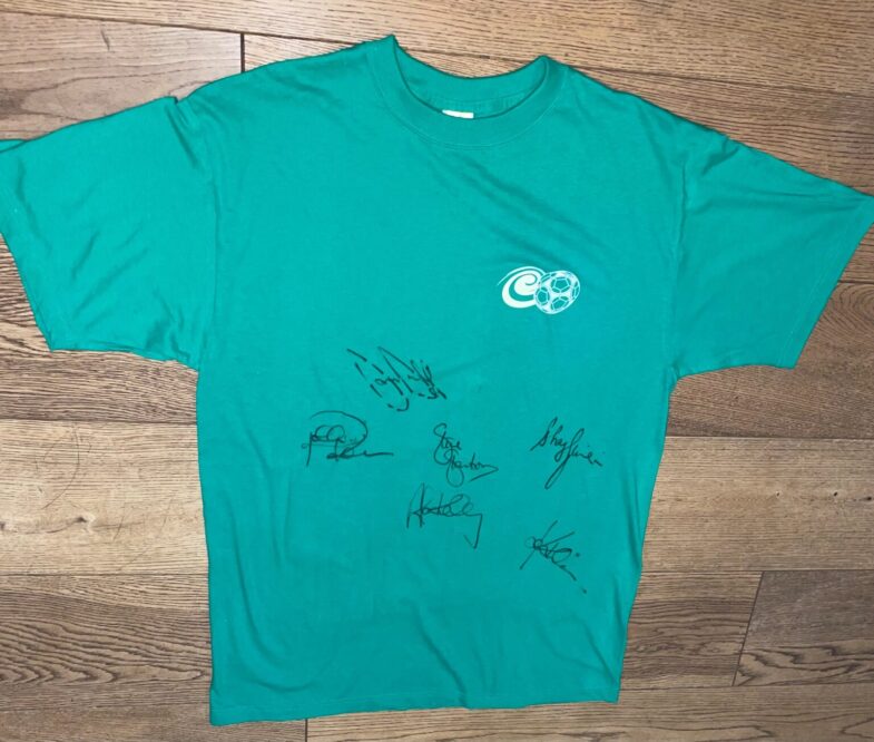 Auction of unique T-shirt signed at Ireland’s training camp in Izumo, Japan at the 2002 World Cup! Donated very kindly by James Helm, BBC’s Dublin Correspondent at time of World Cup 2002. All proceeds going to Cancer Research.